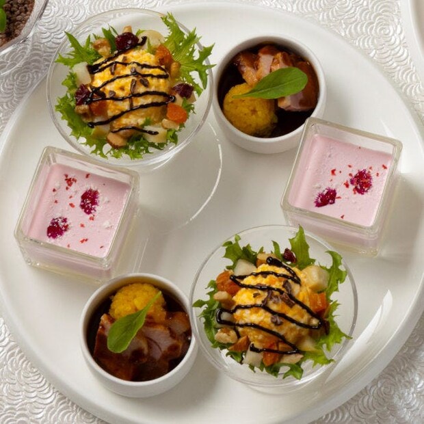 3段目に登場する「ホワイトチョコレートのクリーム&ビーツの冷製スープ」も必見。甘味と塩味が絶妙に調和する冷製スープは、ホワイトチョコレートクリームとビーツのスープを層にして、仕上げにピンクペッパーとホワイトチョコレートをトッピング。見た目にも美しい1品に。