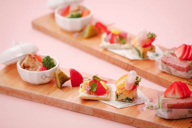 セイボリーは、いちご入りのオーロラソースでいただく「蟹と彩り野菜のスパニッシュオムレツ」や、「近江鶏といちごのグラチネ」などの全4種。地元食材を活かしつつ、すべてのセイボリーにいちごを取り入れた遊び心あふれるアイテムに心ときめいて。