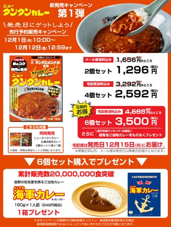 また、調味商事オンライン、横須賀海軍酒保 楽天市場店、横須賀海軍酒保 Yahoo!ショッピング店にて6個セットを購入した人には「よこすか海軍カレー」1箱がプレゼントされる。