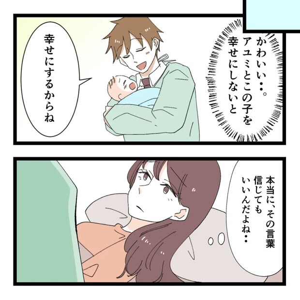 ヒロトさんが元カノとまだ続いているのかもしれないという不安を抱えたまま結婚したアユミさん。生まれた我が子を抱きながら「幸せにするからね」と言うヒロトさんの言葉を嬉しく思うものの、「本当に、その言葉信じてもいいんだよね・・」と信じ切れない気持ちがありました。