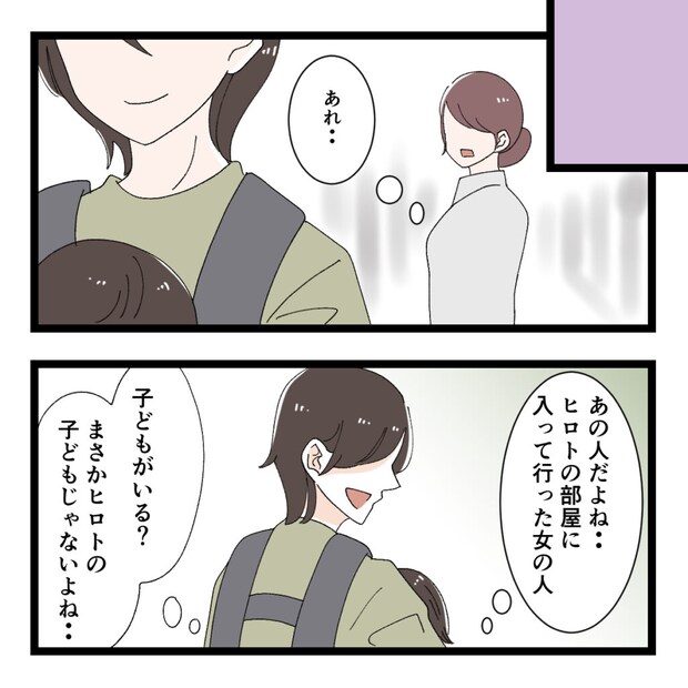 数年後、道で子どもを抱いた女性とすれ違ったアユミさんは、女性の顔に見覚えがありました。「あれ・・あの人だよね・・ヒロトの部屋に入って行った女の人。子どもがいる?まさかヒロトの子どもじゃないよね・・」その女性は、結婚を控えていた時期にヒロトさんの部屋に入って行った女性でした。