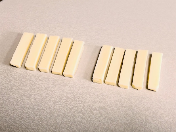 2. ベビーチーズは長い辺に沿って縦に切り、1個を5等分にします。全部で10本できました。