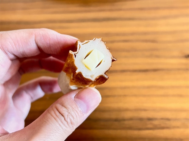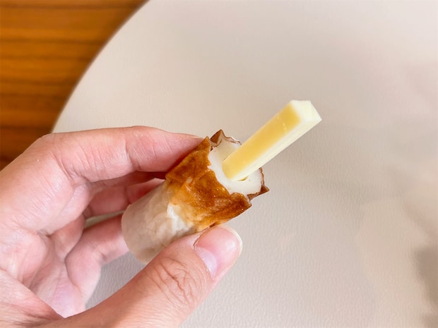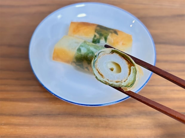 ひと口食べてみると、春巻きの皮のパリパリ感と、ちくわのプリプリとした弾力が感じられました。これは初めての食感かも。そして、ちくわの中のトロッととろけたチーズがとっても濃厚…。ですが、青じそが入っていることによって、さっぱりと食べられます。