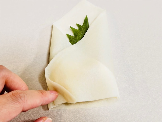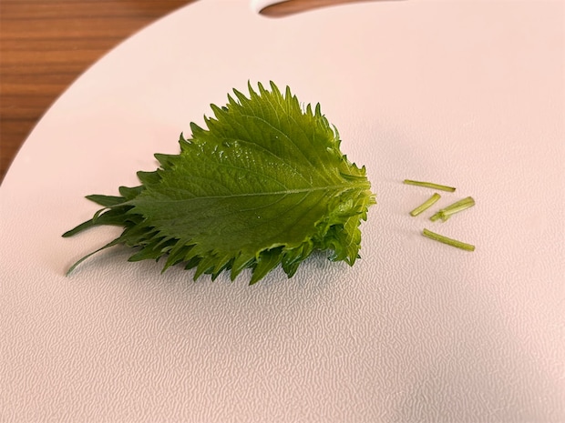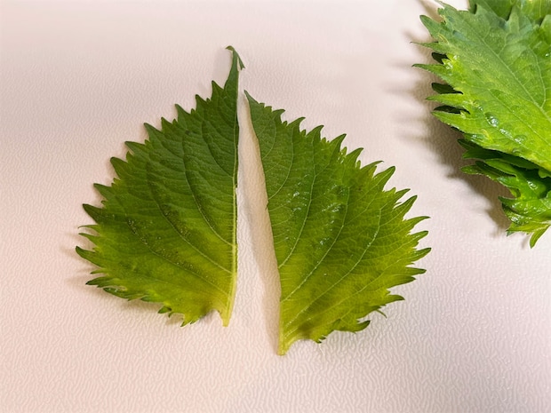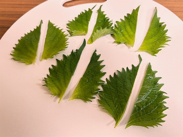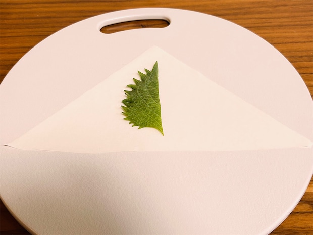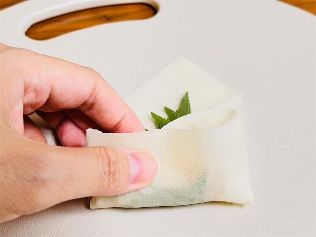 春巻きの皮を、光沢のある面を下にして平らな場所に置きます。真ん中あたりに4の青じそを置きます。青じそは表面を下にして置くようにしましょう。こうすることで、巻いた時にきれいな見た目になるのだと思います。