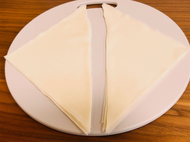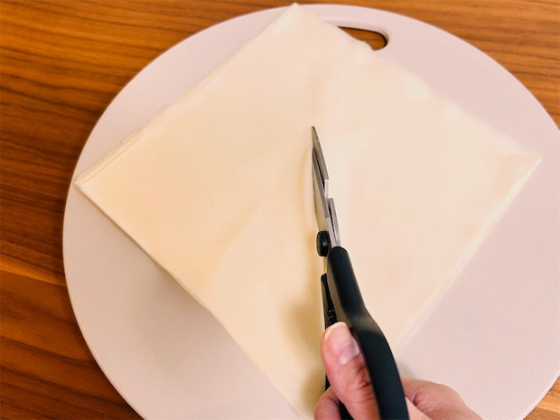 5. 春巻きの皮を、キッチンばさみを使って、対角線上で半分にカットします。
