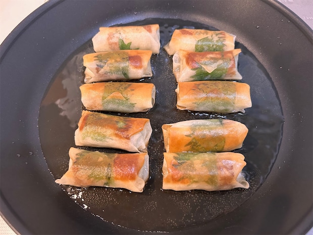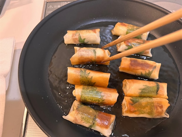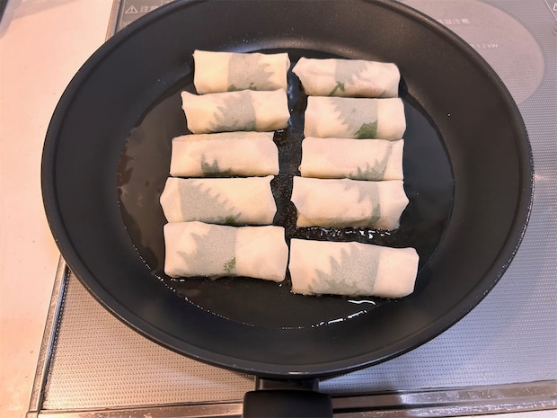 油が温まったら、6の春巻きを、巻き終わりを下にして並べ入れます。