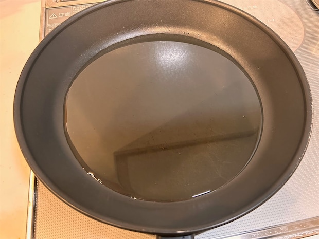 7. フライパンにサラダ油(分量外・適量)を深さ3mmほど引いて、中火で温めます。