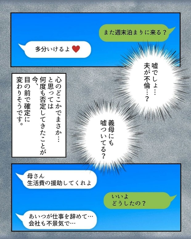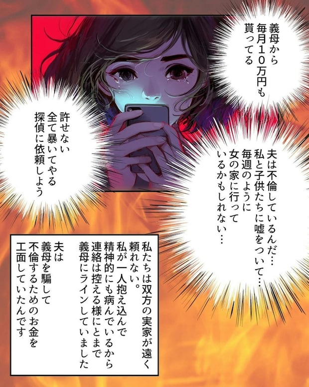 亜希のカンは当たっていました。出張ではなく、女の家に毎週通っていたなんて…。さらに夫は、自分の母親をだまし、不倫をするためのお金を工面していたのです。大切な家族を裏切っていた夫に怒りがわいてきます…。