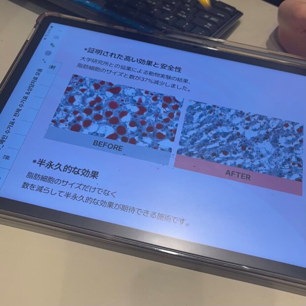 カウンセリングでは、体の脂肪量・筋肉量・水分量などをスキャニングして、そのデータをもとに体重目標や、どんな施術を組み合わせるべきかを相談します。私は特に下半身に脂肪がつきやすい体質で、お尻下~太ももにかけての脂肪溶解注射と、ダイエット薬(3か月分)を処方してもらいました。ダイエット薬は、その人の目標体重や体調・体質・普段から服用している薬などに合わせて専門医が処方してくれます。