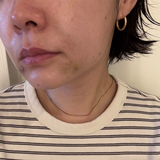 ただし!! いちばん気を付けたいのが、“顔が変わってしまう”ダウンタイムがあるということ!! 受けた当日は特に異物を入れた感が半端ない(笑)。笑っていないのにつねに口角が上がっていて、のっぺりしており、旦那には「ジョーカーみたい!」と言われました(笑)。レディアスを入れた部分は触ると硬く、先生からはつねにマッサージをするようにとのこと。2~3日後にじょじょに硬さが取れていき、1週間後には出ていたあざも含めて気にならなくなりましたが、1週間はマスクを外せず“このままジョーカーだったらどうしよう”と焦りながら、マッサージを繰り返していました。