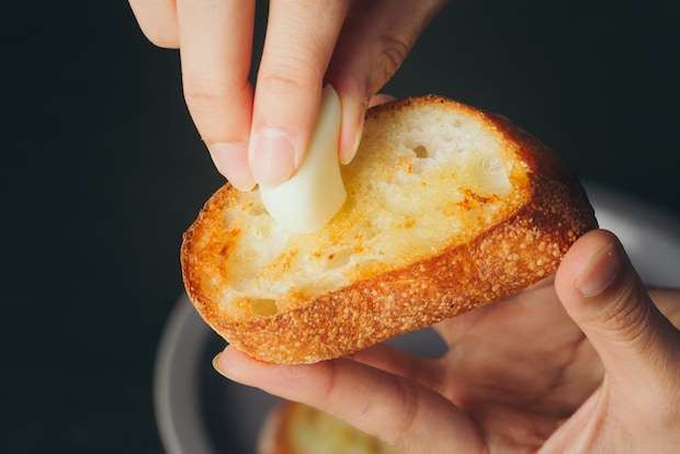 1. バゲットにオリーブオイルを薄く塗り、トースターでこんがりと焼く。焼き上がったらにんにくをこすりつける。