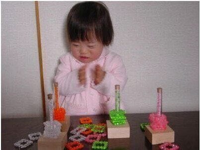 おすわりができるようになると追視(目で物を追う)の練習、型はめの練習、色の識別など発達に合わせて課題が出されました。
