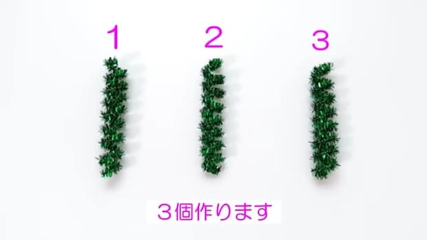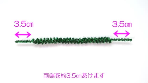 3つ通したら、直線のモールの両端を約3.5cmずつあけます。巻いた3つのモールを真ん中に集めるイメージです。