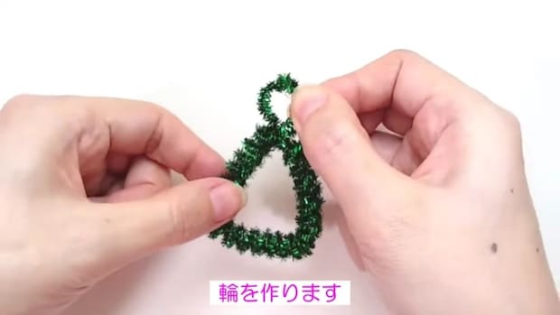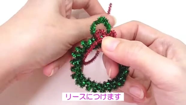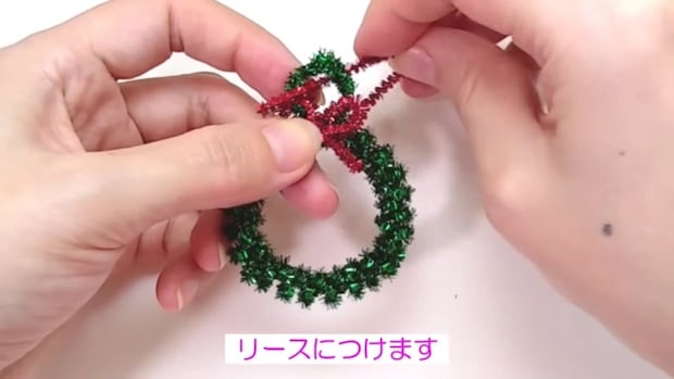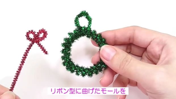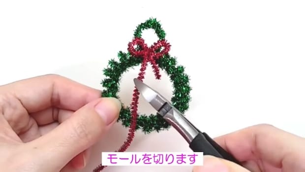長く残しておいたモールを、リースに巻きつけるように固定してましょう。