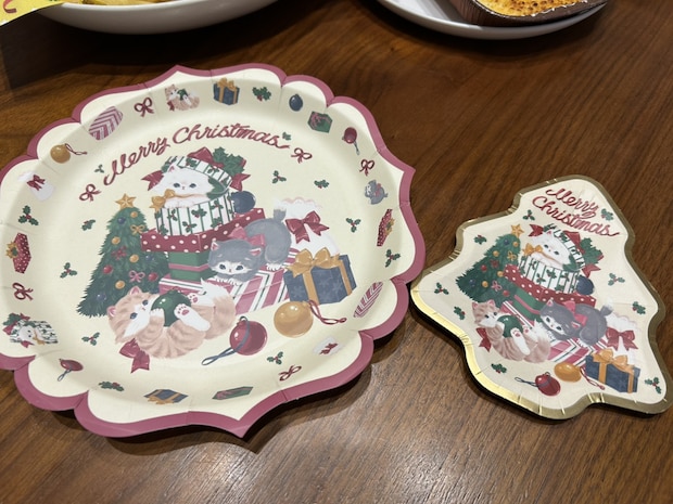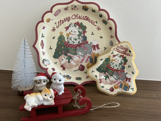 クラシックアニメに出てきそうなキュートな猫ちゃんたちの絵柄と、ダイカットのデザインが110円とは思えないペーパープレートです。