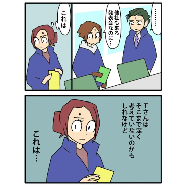 過去の発表会資料を丸写ししていたことが、ほぼ確定となったTさん。他社も参加する重要な場に、盗作した資料でのぞもうとしていたことに、社員たちは衝撃を受けます。