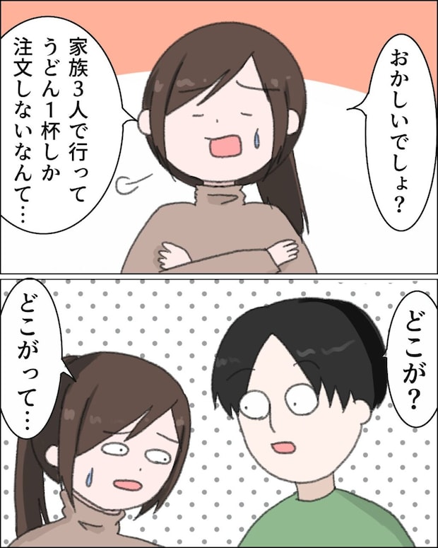 「おかしいでしょ?家族3人で行ってうどん1杯しか注文しないなんて・・」呆れながらそう言うと、「どこが?」と全く響いていない様子。「どこがって・・」となんと言えば通じるのか途方に暮れてしまいました。