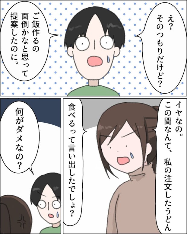 「え?そのつもりだけど?ご飯作るの面倒かなと思って提案したのに」良かれと思って提案したつもりのヒロユキは驚いてそう言い、「イヤなの。この間なんて、私の注文したうどん食べるって言い出したでしょ?」私がそう言い返すと、「何がダメなの?」と不思議そうに聞き返すヒロユキに、