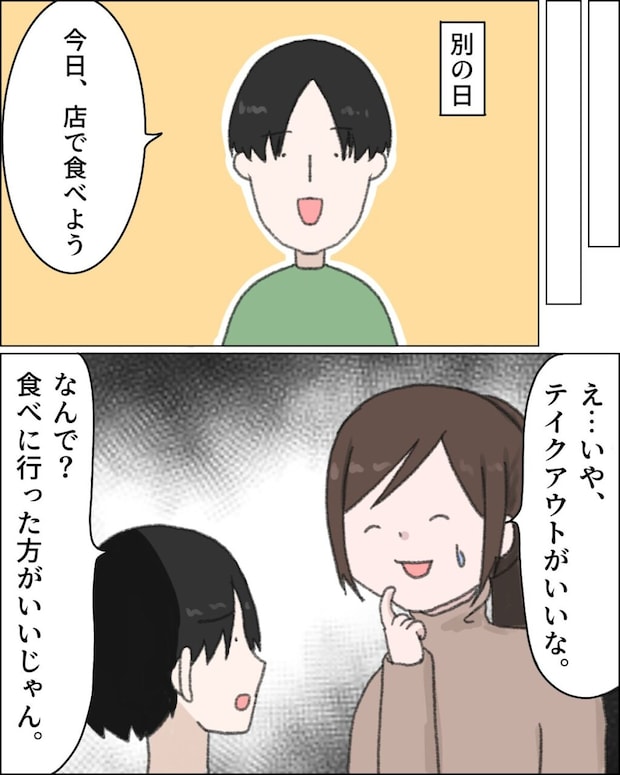 「今日、店で食べよう」ヒロユキがそう言い出し、「え・・いや、テイクアウトがいいな」と答えると、「なんで?食べに行った方がいいじゃん」と即答。
