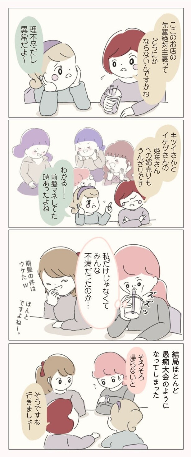 子ども服ブランドでショップ店員をしているぼのこは、数ある店舗の中でも花形のB店へ異動が決まった。B店は花形と言われる一方で、昔からの派閥争いが有名。新人や異動してきたスタッフがすぐに退職してしまうという疑惑があるのだった。緊張の中、異動初日を迎えたぼのこは、早速、店長やスタッフたちから理不尽な思いを受ける。ねちねちマウンティングや悪口に陰口、過剰な先輩優先システムなど…。やがて心身ともに疲弊したぼのこは、この店舗に誰一人味方がいないことを確信。お店の悪しき風習を断ち、スタッフたちに「復讐」するため、ぼのこは店長を目指すことを決意するのだった――。