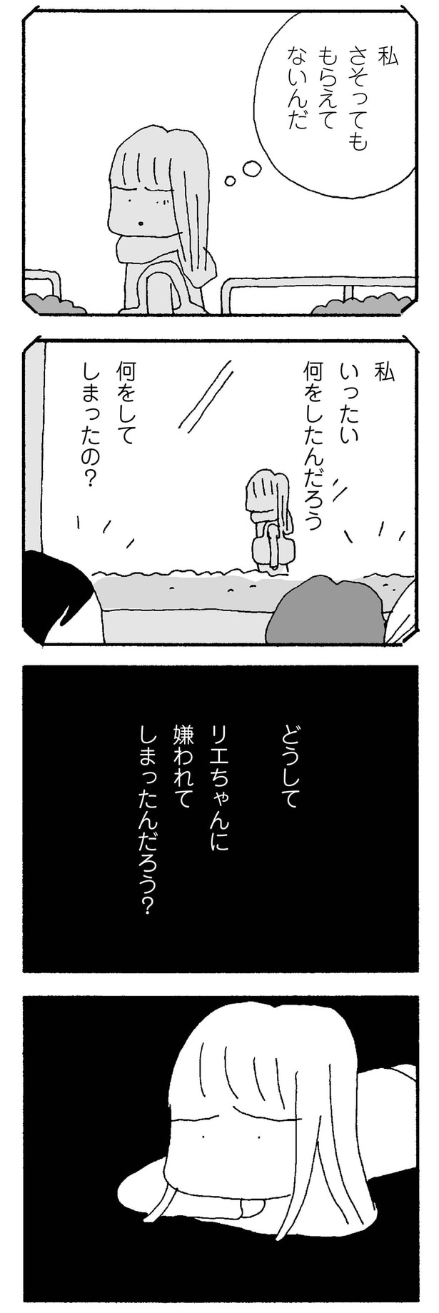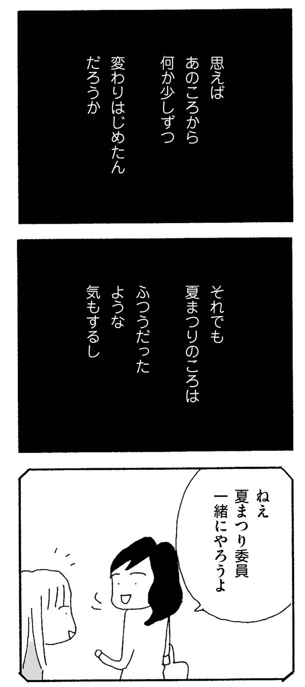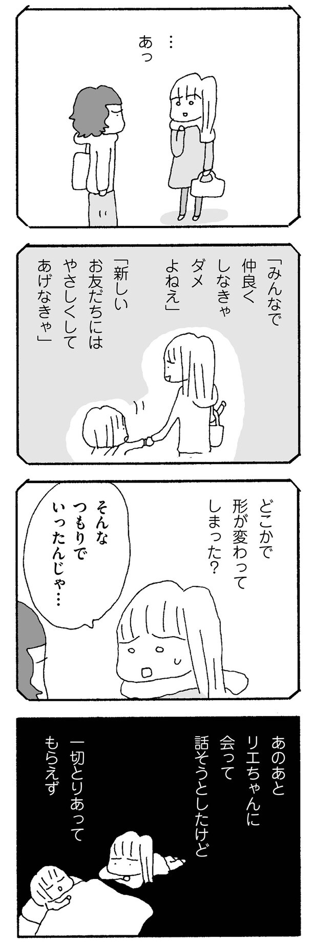 ある日、1番仲が良かったママ友から無視をされた――。主人公のサキは、幼稚園に通う娘のミイちゃんと夫との3人暮らし。ミイちゃんが幼稚園に入園したとき、初めてできたママ友が、ののちゃんのママ・リエちゃんだった。2人は子どもたちも交えて毎日一緒に遊ぶほど仲が良かったが、ある日突然、サキはリエから無視されるようになる。理由に心当たりがないサキが他のママ共に理由を聞いてみると、どうやらリエに誤解されているようで…!? 一方で、リエの中でもサキに対して複雑な思いがあった。果たして、2人の関係はどう動いていくのか…?