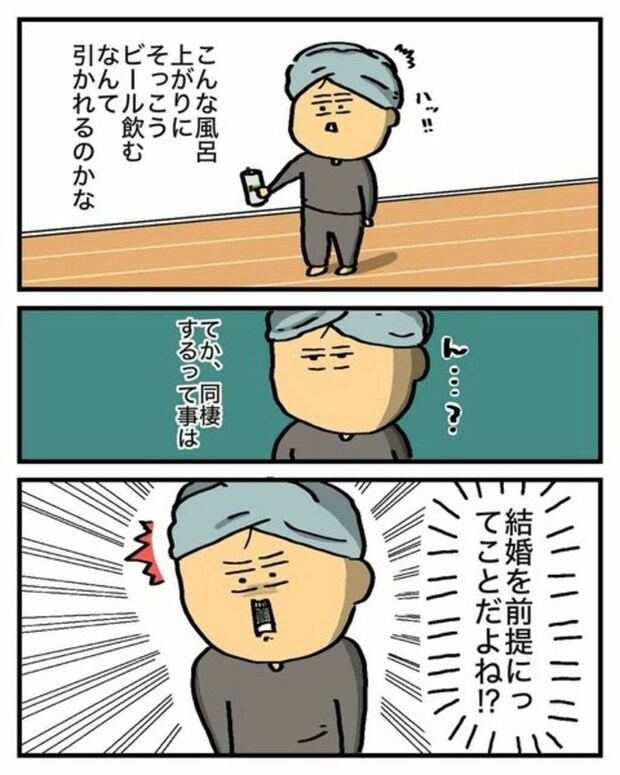 恋人シゲオさんに一緒に住もうと誘われたエクボさん、帰宅してよく考えてみます。同棲するということは、結婚を前提にってことかなと気づき、結婚なんて自分にできるんだろうか、しかし結婚を迷いながら付き合うのは大迷惑では?と思い悩んでしまいます。