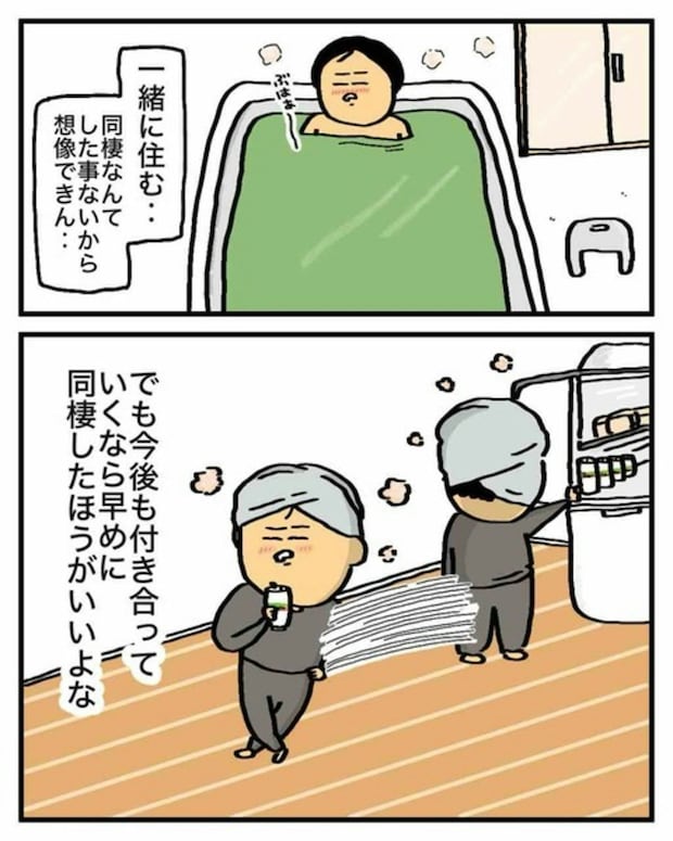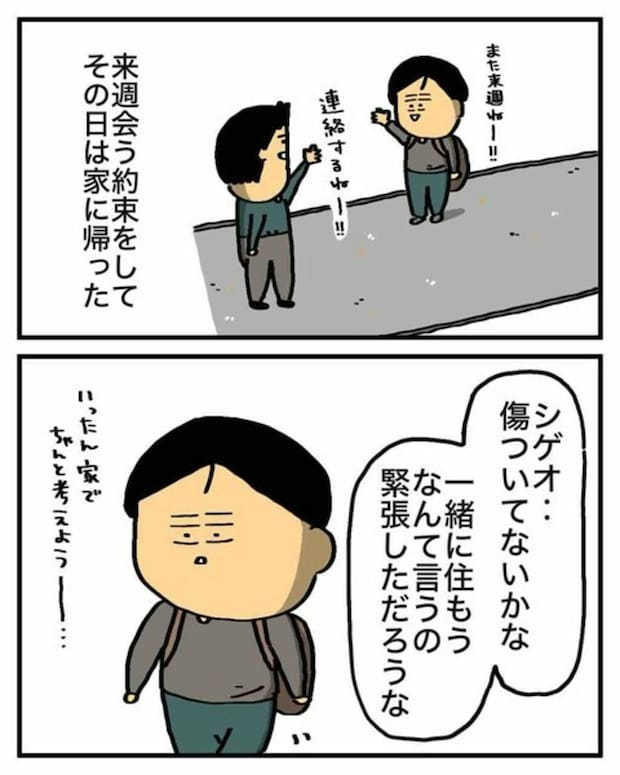 シゲオさんが勇気を出して一緒に住もうと言ってくれたはず、と思うエクボさん。自分もちゃんと考えなければと思います。