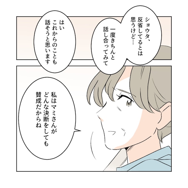 「ショウタは反省してるとは思うけど、一度きちんと話し合ってみて」そう話す義母に私は「はい、これからのことも話そうと思います」と答えます。すると義母が、「私はマミさんがどんな決断をしても賛成だからね」と優しく言ってくれました。