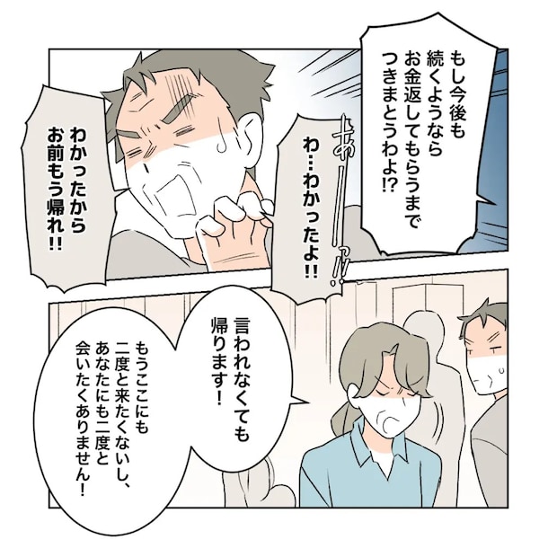 「もし今後も続くようならお金返してもらうまでつきまとうわよ!?」義母の剣幕に押されたのか、義父は勘弁してくれというような顔で、「あー!わかったからお前もう帰れ!」と言いました。それに対し義母は「もうここには二度と来たくないし、あなたにも二度と会いたくありません!」そう言うと、さっさと部屋から出て行きました。