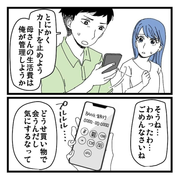 主人公夫婦は、夫の姉(義姉)と協力し、義母の財産管理や日々の買い物の手助けをしていました。主人公夫婦は生活上必要な際に車を出し、義姉がお金の管理をする分担です。