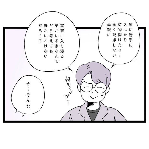 「家に勝手に入ったり荷物開けたり・・全く配慮しない母親に、実家に入り浸る弟がいる家なんて、どう考えても来たいわけないだろ・・?俺もイヤだし・・」と正論を告げるカズヤさんに、「そ・・そんな」とタクヤは困りました。
