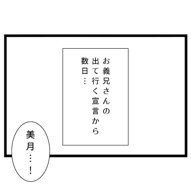 夫タクヤさんの実家の敷地内で同居している美月さん。その家は結婚予定の義兄カズヤさんが住むために建てるも単身赴任になり住めなくなったと義母に言われて住むことにしたものの、義母の過干渉に悩まされることに。引っ越したいと訴える美月さんとタクヤさんが喧嘩になり、タクヤさんは義実家へ。そんなとき、カズヤさんにカフェに呼び出され、実は最初からタクヤさんと美月さんが住むために義母とタクヤさんが計画して建てたものだと知り呆然。タクヤさんとは別れたくないけれどあの家には居たくないと言うと、一緒に物件を探すとカズヤさんが言ってくれ、週末は2人で出かけるようになりそれを見ていた義母はハラハラ。そして週末「もうそっちに帰らない」とタクヤさんにメッセージを送った美月さんは、美月さんとカズヤさんの仲を勘ぐるタクヤさんにうんざりしてタクヤさんと義母からも届くメッセージを放置することに。翌朝義実家では、美月さんが鍵を返しに来ると言うカズヤさんの言葉にタクヤさんと義母はびっくり。その後、家の鍵を返しに行った美月さんに文句を言うタクヤさんと義母に怒りがこみ上げた美月さんは、タクヤさんが嘘をついていたことを問い詰めるため、2人で話したいと義母に申し出て「もうずっとお義母さんといた方がいいんじゃない?」と突き放した美月さんに、「兄ちゃんとコソコソ浮気してんじゃねーの!」と言い出すタクヤさんに呆れます。ドアを開けて入って来たカズヤさんが家を出ると言い出し、一緒にやって来た義母はビックリ!問い詰めるもカズヤさんは何も答えませんでした。