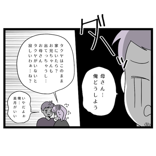 カズヤさんが家を出て行くと宣言した後、「どうせタクヤこの家にずっといるんだろ?」と呆れたように言い、慌てて「俺が出てくから兄ちゃんが住めよ!」と言うも、「義母と弟が入り浸ってる家になんて来たいわけない」と正論を話すカズヤさん、往生際の悪いタクヤさんには、新しく住む家の住所は教えないと去って行く美月さん、寂しいからと義母に引き留められるタクヤさん、全て自分が招いたことですよね。
