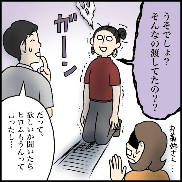 義姉はその場に膝から崩れ落ち、「うそでしょ?そんなの渡してたの?」と力なく言いました。その横でジュンペイが「だって欲しいか聞いたらヒロムもうんって言ってたし・・・」と弁解しますが、義姉の耳には届いていないようです。