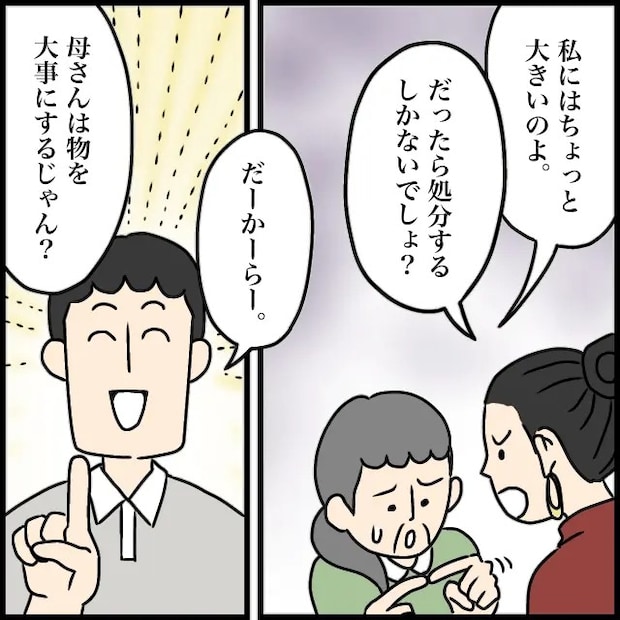 義姉に正論を言われて怯んだのか、義母は指先をつつきながら「私にはちょっと大きいのよ」と答えました。義姉はすぐさま「だったら処分するしかないでしょ?」と畳みかけます。すると2人のやり取りを見ていたジュンペイが、義母を庇うように「だーかーらー、母さんは物を大事にするじゃん?」と口を挟んできました。