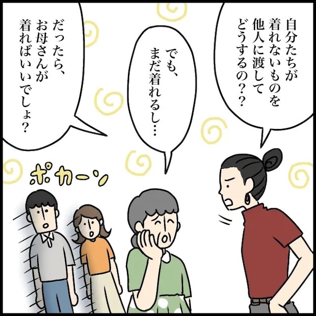 義姉が「自分たちが着れないものを他人に渡してどうするの?」ともっともな指摘をしても、義母は「でも、まだ着れるし・・・」と曖昧な返事。すると義姉は間髪入れずに「だったらお母さんが着ればいいでしょ?」と返しました。