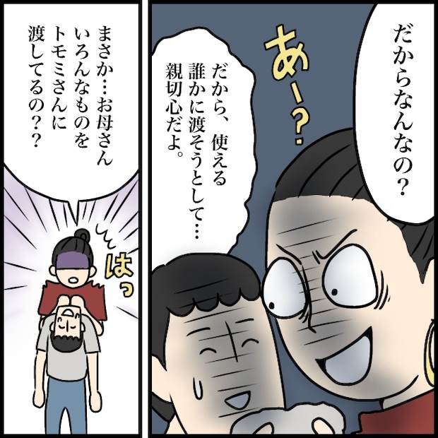 義姉はジュンペイの胸ぐらをつかみ、低い声で「だからなんなの?」と圧をかけます。ジュンペイは気迫に押されながらも、「だから、使える誰かに渡そうとして・・・親切心だよ」と答えました。すると義姉は何かに気付いたのか、「まさかお母さん、いろんなものをトモミさんに渡してるの?」と聞きました。