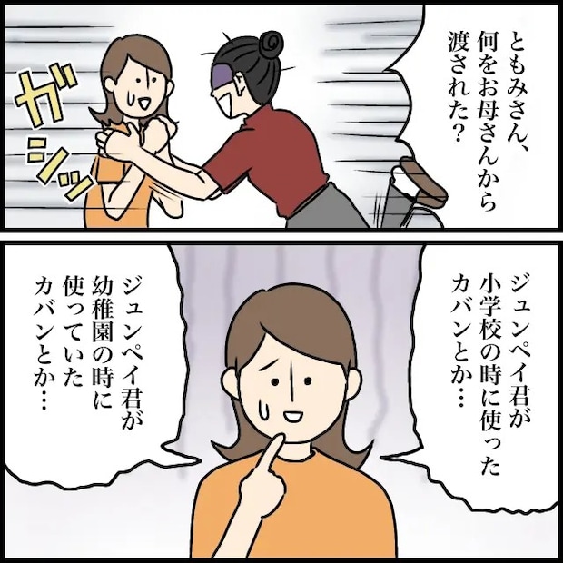 「トモミさん、何をお母さんから渡された?」義姉は私の肩を力強く掴み、問いただします。「ジュンペイくんが小学校の時に使ったカバンとか、幼稚園の時に使っていたカバンとか・・・」私は正直に直近でもらったものを伝えました。
