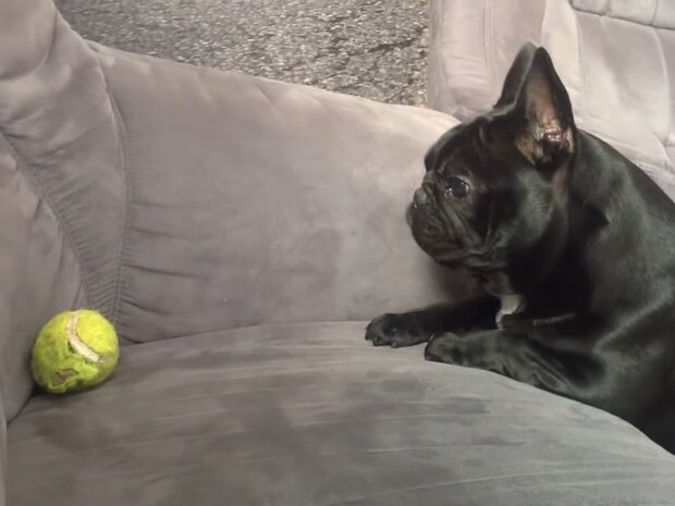 注目を集めたのは「BlanKy French Bulldog Too Funny」という動画。冒頭では、遊び相手のテニスボールに手を伸ばすフレンチブルドッグのキュートな様子が映っています。しかし、ソファの奥にあるボールをつかもうと前足を必死に突き出すも、微妙な位置にあるため届かない模様…。取れそうで取れないその姿に、飼い主も思わず笑い声が漏れてしまいます。