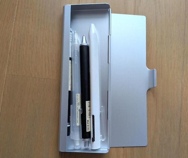 太めのペンを1本入れると4本ほど、全て通常の太さのペンであれば5本は入るので、最低限の筆記用具は入ります。