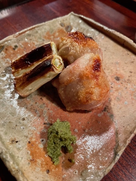 京都の赤地鶏とねぎを柚子胡椒とともに。1人だとこれくらい少しずつが最高です。