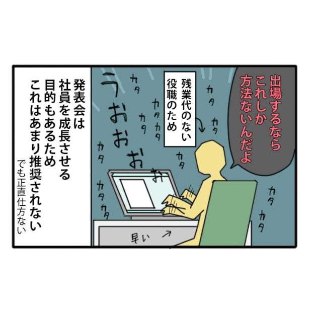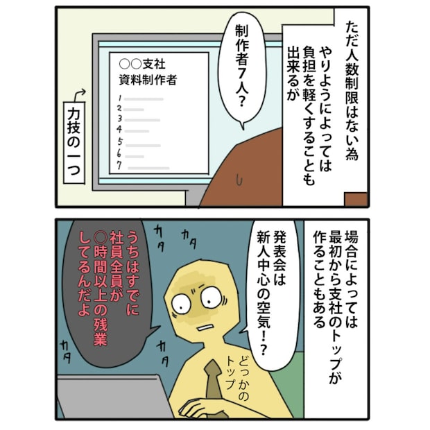 「欠席」が許されない、発表会…。多人数で取り組むケースもあれば、残業時間を増やさないよう、支社のトップ自ら発表者となるケースもあったようですね。プレッシャーの大きさを感じさせます。