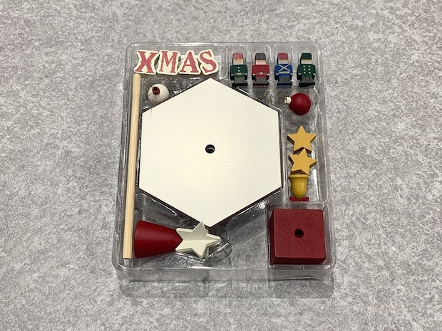 箱を開封してみると、組み立て用のパーツが複数個入っていました。星、赤色のオーナメント、”XMAS”の文字、兵隊のオブジェなどクリスマス感は満載です♪