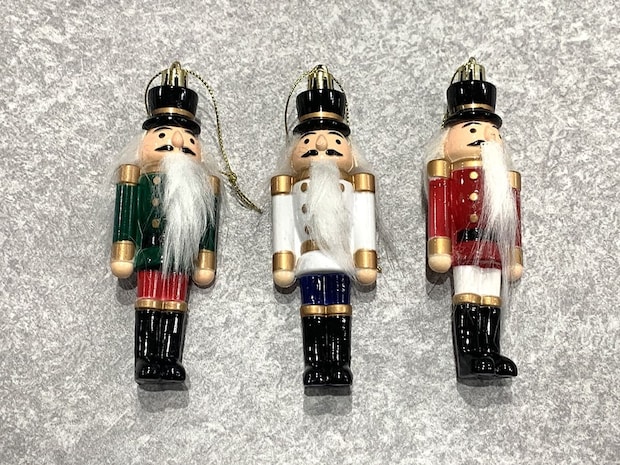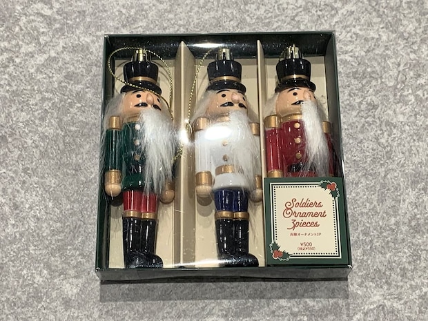 くるみ割り人形が3体入ったクリスマスツリーのオーナメント。グリーン、ホワイト、レッドの3色展開で、価格は550円(税込)となっています。