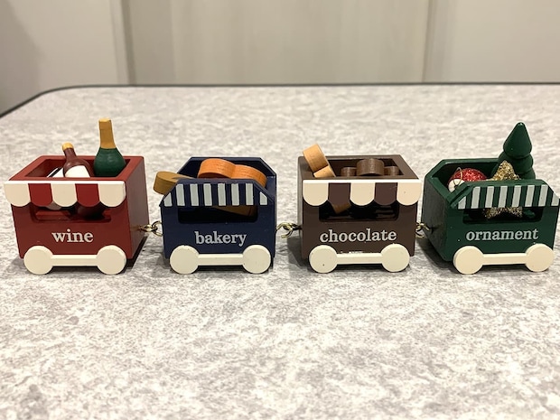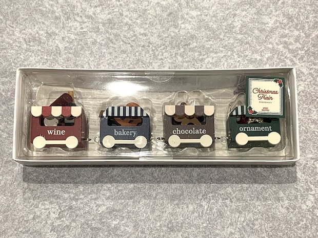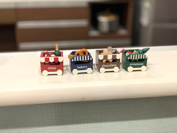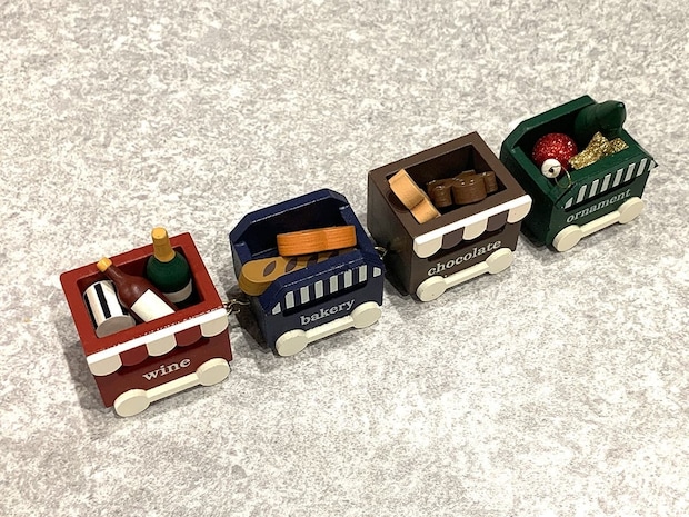 赤い車両のwine、青い車両のbakery、茶色の車両のchocolate、緑色の車両のornamentから成るインテリア雑貨。価格は550円(税込)です。