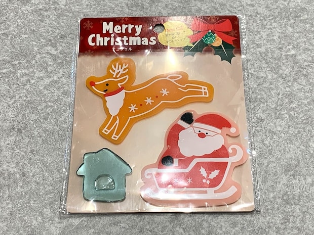 ソリに乗ったサンタ、トナカイ、家の3種のシールが入ったアイテム。価格は110円(税込)となっています。