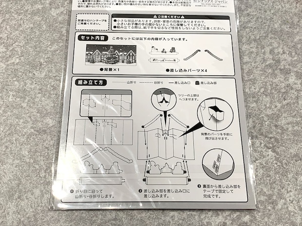 パッケージの背面にセット内容や組み立て方が載っているので、確認しながらディスプレイを作っていきます。