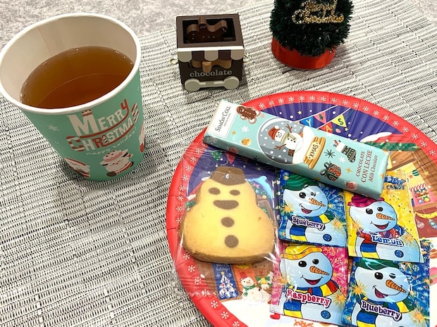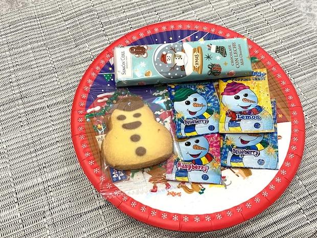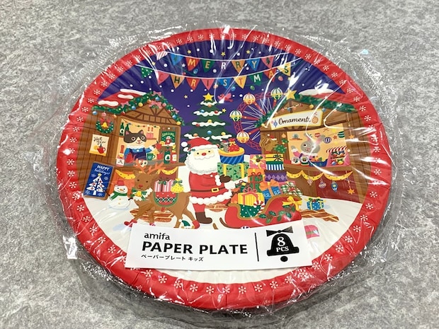 筆者はペーパープレートの上にお菓子を乗せてみました。シンプルなお菓子でも、クリスマス柄のプレートに乗せるだけでイベント感が一層アップ!