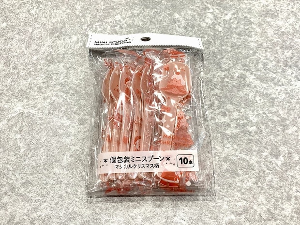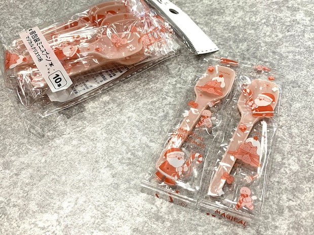 1本ずつ包装にサンタやケーキなどが描かれているミニスプーン。10本入って価格は110円(税込)となっています。