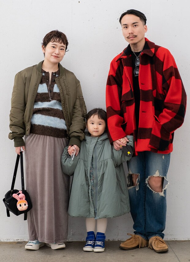 それぞれの着たい柄を自由に楽しむファミリーコーデがリズミカルでおしゃれ! パパとキッズのアウターをメインにしたバランス感のあるスタイリング術はさすが。今季トレンドのブラウンをつかったママのマタニティコーデはぜひ参考にしてみて♪